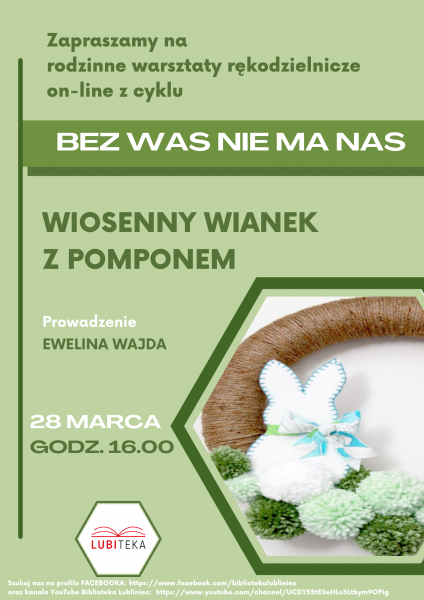 Choć za oknami jeszcze chłód, ani się obejrzymy i zawita do nas wiosna, a wraz z nią Wielkanoc. Aby dobrze się do niej przygotować zapraszamy Was na warsztaty rękodzielnicze z cyklu Bez Was nie ma Nas, na których wykonacie wiosenny wieniec z pomponami. Ozdobimy go dodatkowymi wielkanocnymi akcentami.
