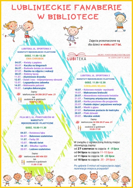 Lubliniecka Biblioteka przygotowała bogaty program warsztatów, aby wspólnie z dziećmi i młodzieżą spędzić wakacyjny czas. Zachęcamy do uczestnictwa w oferowanych zajęciach.