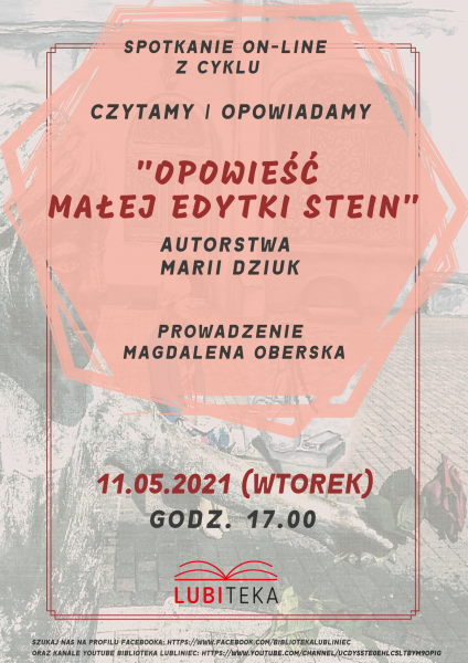 Zapraszamy dzieci, młodzież i dorosłych na drugie spotkanie z cyklu "Czytamy i opowiadamy". Magdalena Oberska przeczyta kolejne fragmenty "Opowieść małej Edytki Stein" autorstwa lokalnej poetki Pani Marii Dziuk.