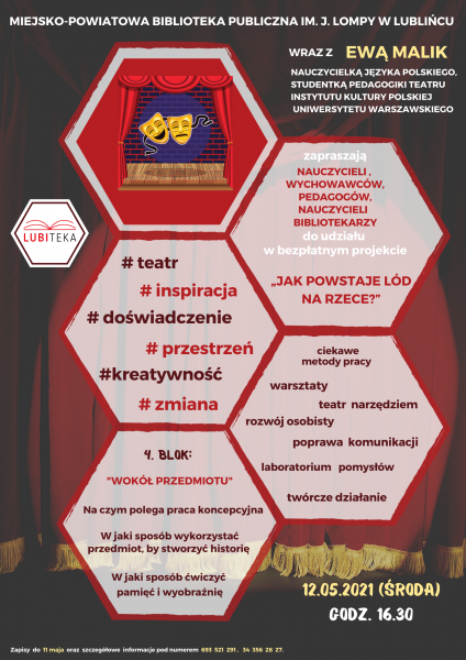 Gdzie szukać inspiracji?, Jak poprawić komunikację?, W jaki sposób rozpoznać potrzeby swoje i grupy? Czy przeszkody mogą być atutem?, Czy teatr może być narzędziem nauczyciela? MIEJSKO-POWIATOWA BIBLIOTEKA PUBLICZNA IM. J. LOMPY W LUBLIŃCU wraz z EWĄ MALIK Nauczycielką języka polskiego, studentką Pedagogiki Teatru Instytutu Kultury Polskiej Uniwersytetu Warszawskiego zapraszają NAUCZYCIELI, WYCHOWAWCÓW, PEDAGOGÓW, NAUCZYCIELI BIBLIOTEKARZY do udziału w bezpłatnym projekcie „JAK POWSTAJE LÓD NA RZECE?”
