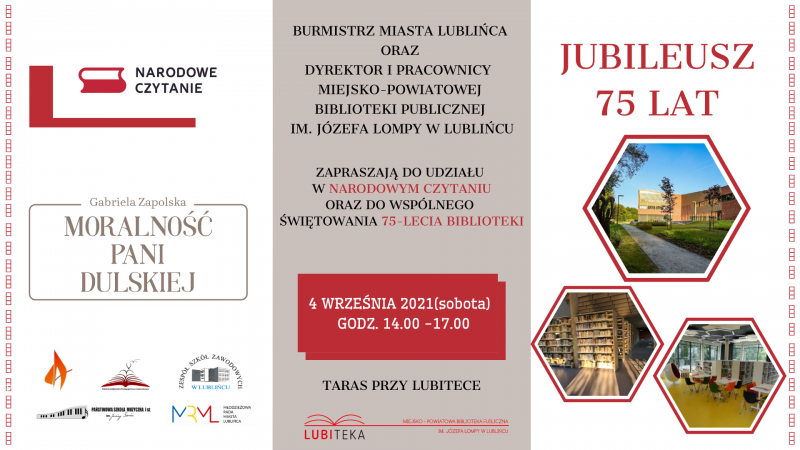 Burmistrz Miasta Lublińca oraz Dyrektor i Pracownicy Miejsko-Powiatowej Biblioteki Publicznej im. JÓZEFA Lompy w Lublińcu zapraszają do udziału w Narodowym Czytaniu oraz do wspólnego świętowania 75-lecia Biblioteki
