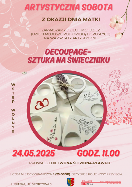 #DzieńMatki2025 #ArtystycznaSobota #Decoupage #PrezentDlaMamy #Lubiteka #WarsztatyDlaDzieci #Twórczość #MiłośćNaŚwieczniku #ZróbToSam #RadośćTworzenia #KulturaDlaRodzin #IwonaŚlezionaPławgo