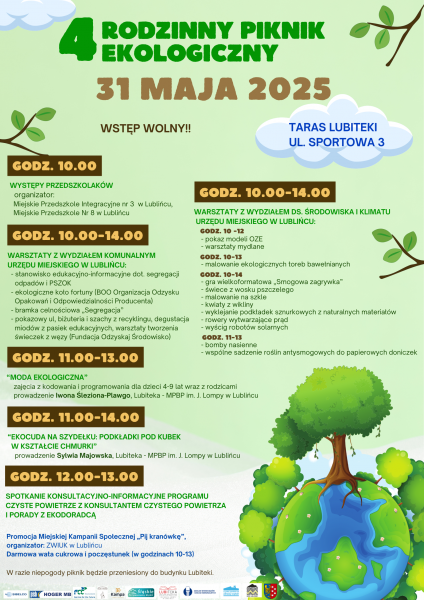 2025-05-31 GODZ. 10.00-14.00, 4. RODZINNY PIKNIK EKOLOGICZNY W LUBITECE