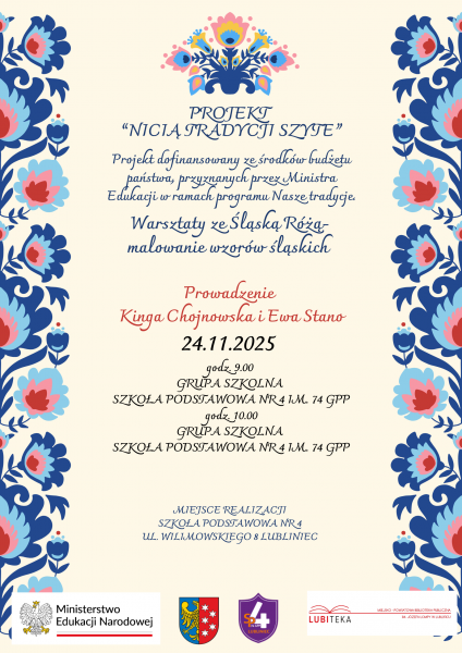 Już 24 listopada 2025 w ramach projektu „Nasze tradycje – Nicią tradycji szyte”, realizowanego przez Miejsko-Powiatową Bibliotekę Publiczną im. Józefa Lompy w Lublińcu we współpracy ze Szkołą Podstawową nr 4, odbędą się kolejne wyjątkowe warsztaty poświęcone malowaniu tradycyjnych śląskich wzorów! ????????